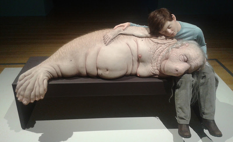Talvez o aspecto mais surpreendente dessas criaturas seja sua transparente serenidade contrastando com sua aparência assustadora e, por vezes, repulsiva. Lembro que, quando estava observando a obra indiviso undivided (foto acima), dentre os visitantes na sala, havia uma menina que parecia ter a mesma idade do garoto retratado. E ela não conseguia se aproximar da obra, olhava aflita para a cena de longe e chamava sua mãe para sair logo da sala.